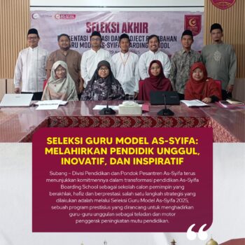 Kami percaya, kepemimpinan lahir dari kedisiplinan, kebersamaan, dan semangat untuk memberi manfaat. Karena itu, As-Syifa bukan sekadar tempat belajar, tetapi rumah untuk tumbuh menjadi pribadi yang percaya diri, peduli pada sesama, berani dan siap menghadapi tantangan zaman. Bergabunglah bersama kami, rasakan pengalaman berasrama yang membentuk jiwa kepemimpinan sejati, dan jadilah bagian dari generasi yang akan membawa cahaya kebaikan bagi umat dan bangsa.
