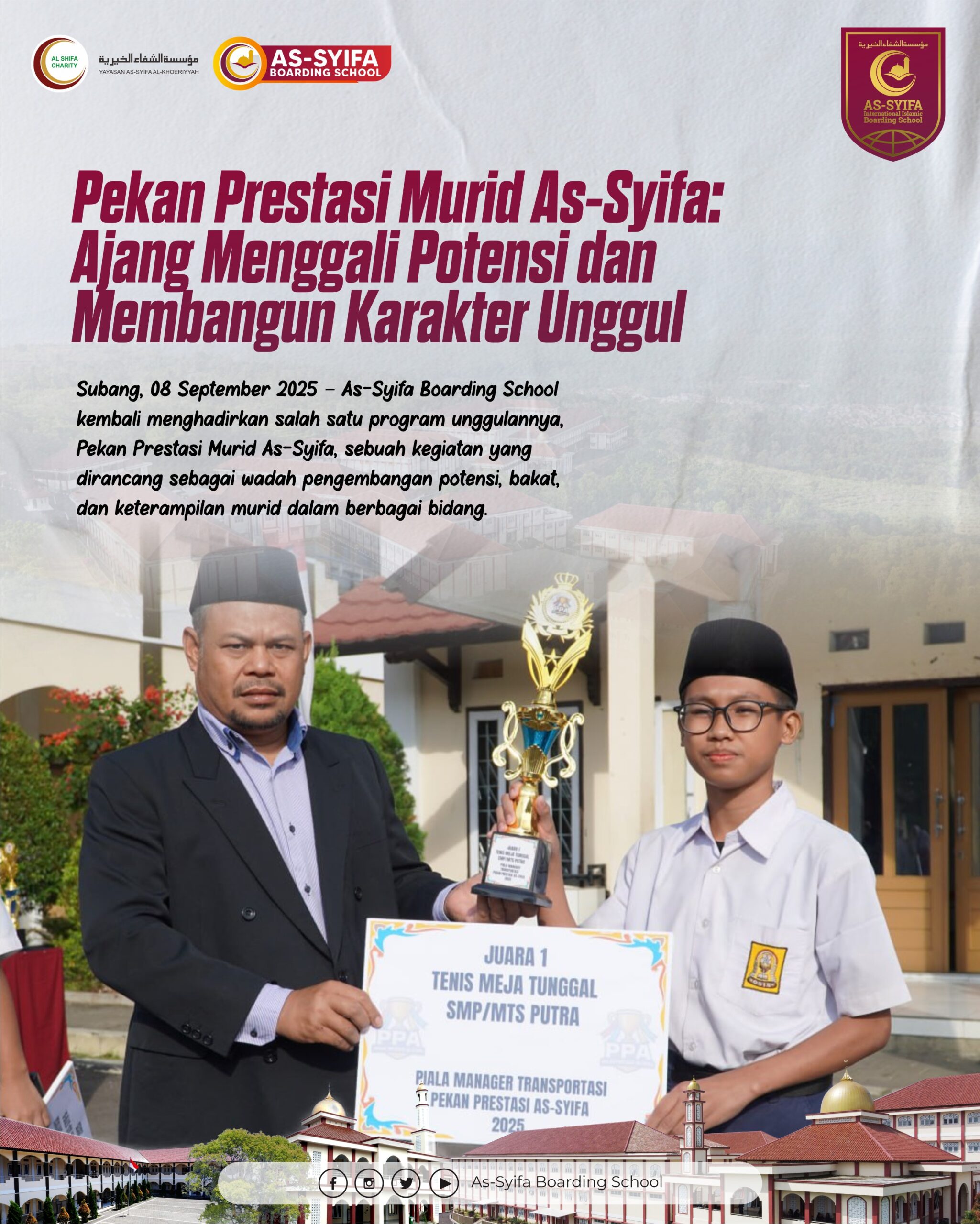 Subang, (08/09/2025). As-Syifa Boarding School kembali menghadirkan salah satu program unggulannya yakni Pekan Prestasi Murid As-Syifa, kegiatan ini gelar sebagai wadah pengembangan potensi, bakat, dan keterampilan siswa dalam berbagai bidang. Kegiatan ini menjadi momentum penting bagi murid untuk menunjukkan kemampuan akademik, non-akademik, serta karakter islami yang telah diasah dalam keseharian pembelajaran di lingkungan As-Syifa Boarding School.